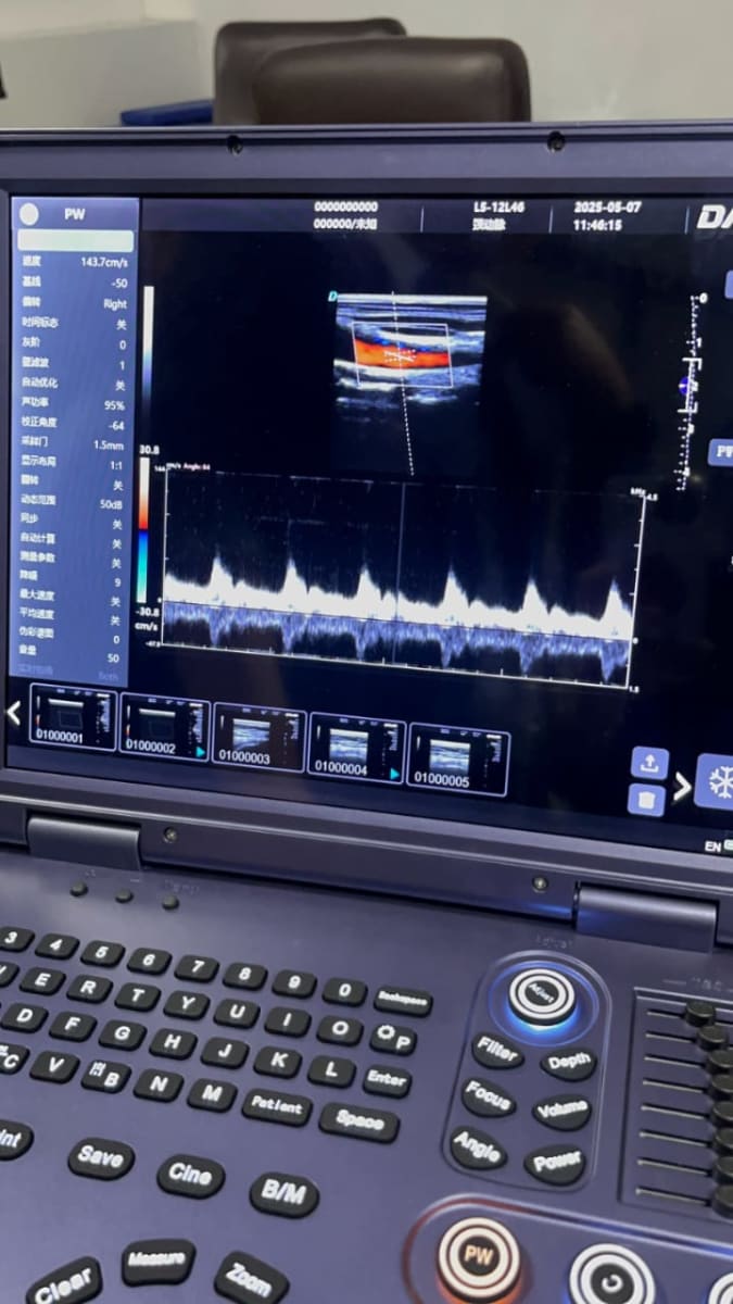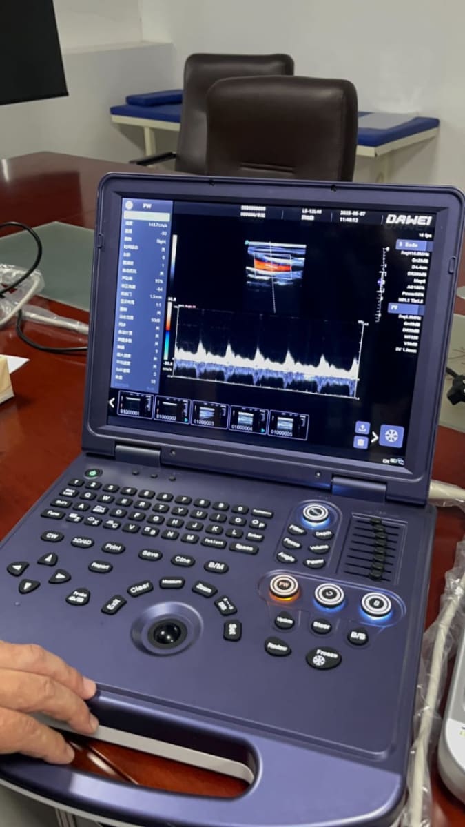 Color Doppler imaging for vascular assessments Spectral Doppler waveform for real-time blood flow analysis Ergonomic controls: PW, B/B, Depth, Print, Save, Freeze Portable design with integrated handle for easy transport Ideal for clinics, mobile diagnostics, and point-of-care use.